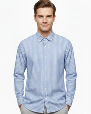Meet your everyday go to the striped slim fit shirt, crafted from a breathable cotton blend that keeps you comfortable all day. Designed for casual wear, this shirt blends 70% cotton, 26% polyester, and 4% elastane for a soft, stretchable fit that moves with you. Its classic vertical stripe pattern gives a refined yet relaxed look that pairs effortlessly with chinos or denim.