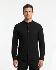 A slim fit mandarin collar long sleeve shirt in 55% linen and 45% cotton, made in India. The waffle texture gives it a distinct surface quality that sets it apart from a plain shirt. Wrinkle resistant, comfortable through a full day, and considered enough for an evening out. True to size.